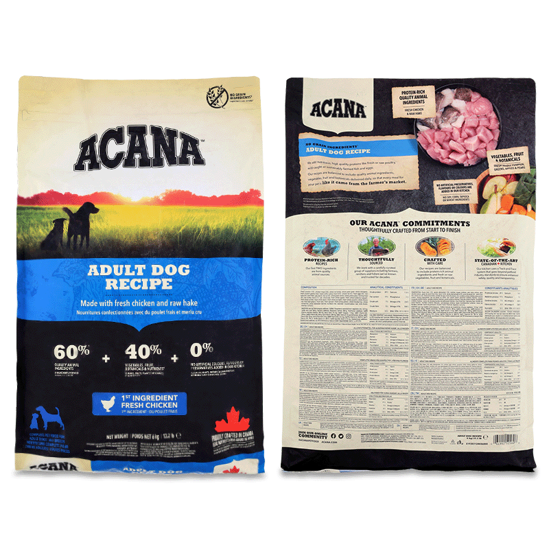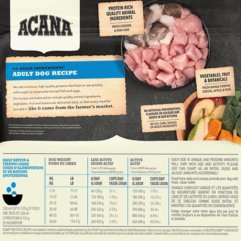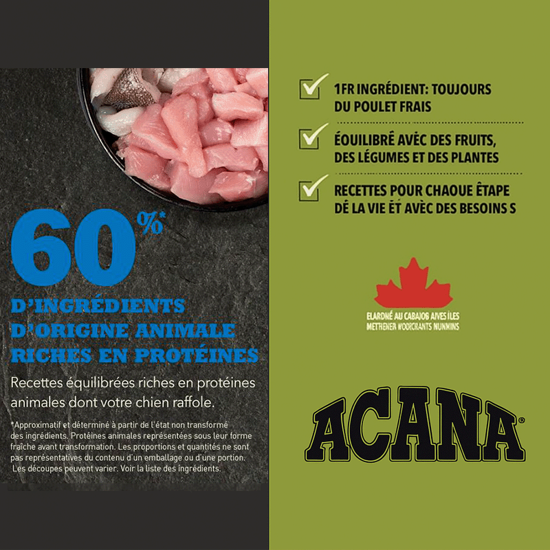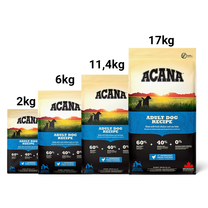 Acana pour Chiens Adultes contient une excellente proportion de 40 % de viandes pour soutenir le développement musculaire optimal, un système immunitaire fort et une peau et un pelage sains. Il est chargé de viande de poulet de qualité supérieure, de poisson de lac sain et d'œufs frais pour une saveur unique pour les chiens. Les légumes et les fruits sont les ingrédients nutritifs clés d'Acana pour Chiens Adultes.