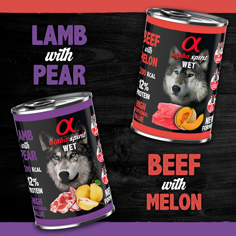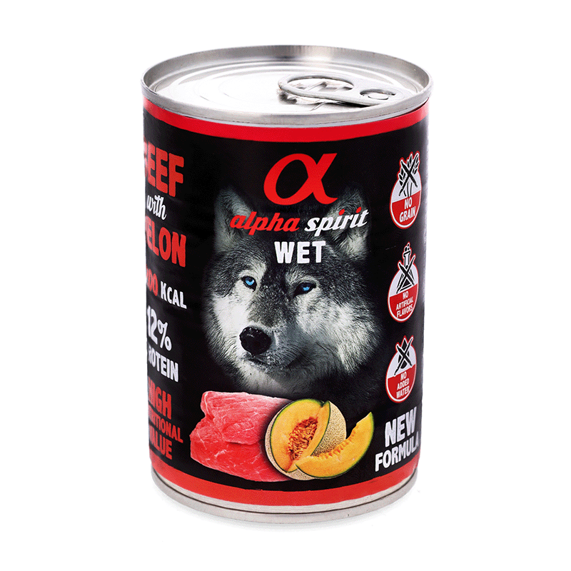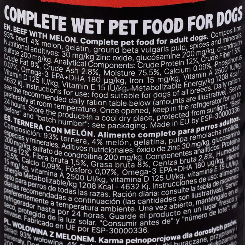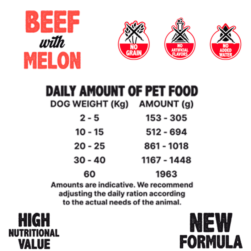 Délicieux pâté avec viande hachée et melon frais, idéal pour les chiens adultes de toutes races.