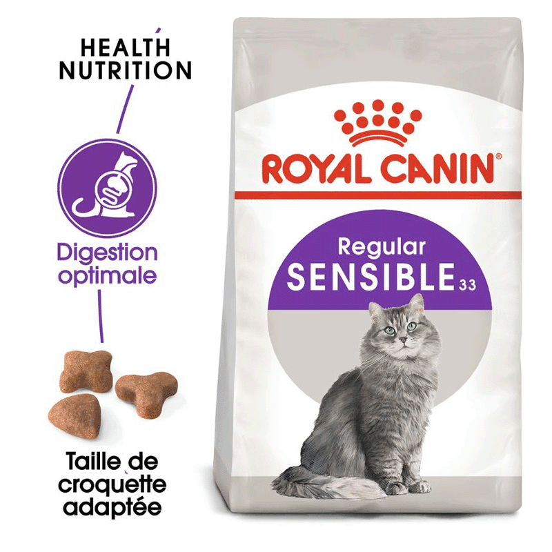 Sensible 33 de ROYAL CANIN® est une alimentation conçue pour les chats adultes (de 1 à 7 ans) ayant une sensibilité digestive.
