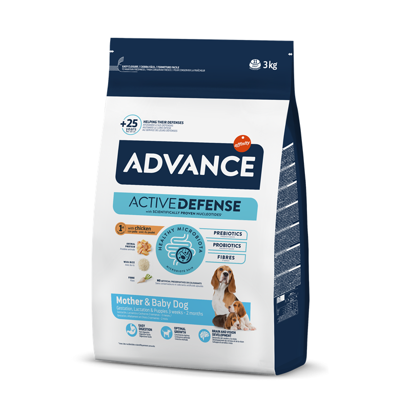 Advance Mother Dog & Baby Dog est une alimentation spécialement conçue pour répondre aux besoins nutritionnels des mères enceintes et allaitantes, ainsi que pour le développement optimal des chiots dès les premières semaines de vie. Cette formule contribue au bien-être des mères et à la croissance saine des chiots de manière globale.