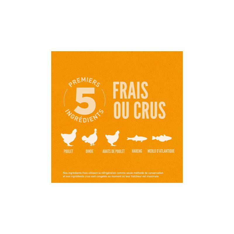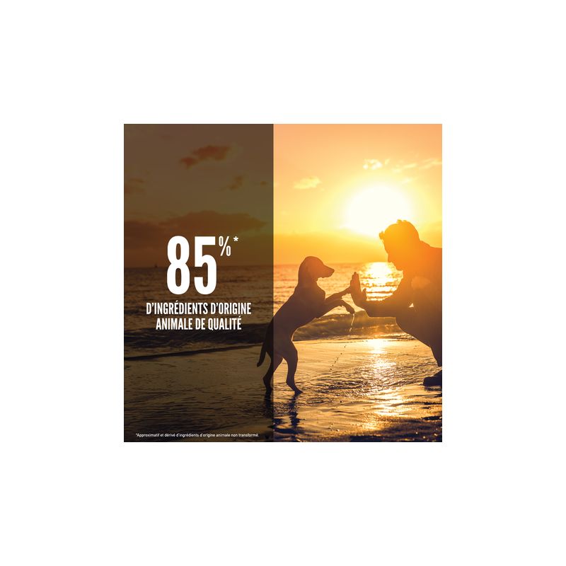 85 % d'ingrédients de qualité d'origine animale, notamment du poulet, de la dinde et du poisson, favorisent une croissance saine.