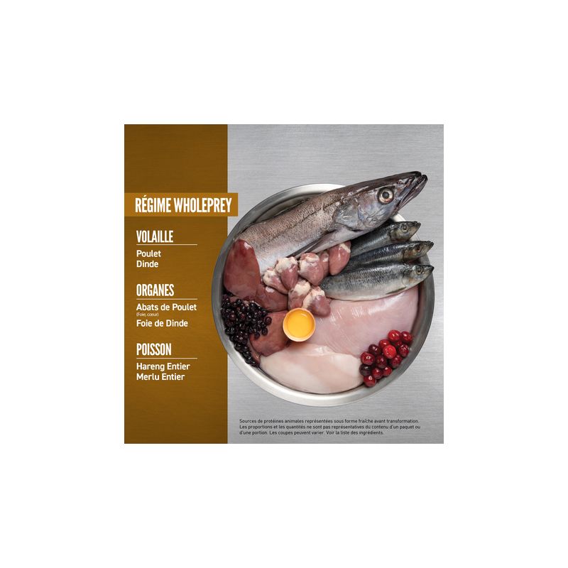 Poulet frais (23 %), dinde crue (10 %), abats de poulet frais (foie, cœur) (8 %), hareng entier cru (6 %), merlu entier cru (5 %), œufs frais (5 %), poulet déshydraté (4 %), dinde déshydratée (4 %), maquereau déshydraté (4 %), sardine déshydratée (4 %), hareng déshydraté (4 %), graisse de poulet (4 %), lentilles rouges entières, pois chiches entiers, lentilles vertes entières, pois entiers, fibres de lentilles, haricots pinto entiers, haricots blancs entiers, foie de dinde cru (2 %), huile de colin (2 %), amidon de pois, algue kelp déshydratée, citrouille entière fraîche, courge butternut entière fraîche, courgettes entières fraîches, carottes entières fraîches, pommes entières fraîches, poires entières fraîches, racine de chicorée déshydratée, chou frisé frais, épinards frais, feuilles de betterave fraîches, fanes de navet fraîches, canneberges entières, myrtilles entières, baies de saskatoon entières, curcuma, chardon-Marie, racine de bardane, lavande, racine de guimauve, cynorrhodons.