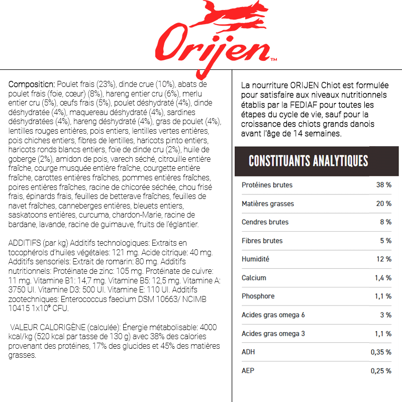 L'énergie métabolisable est de 4000 kcal/kg (520 kcal par tasse de 250 ml/130 g), avec une répartition équilibrée des calories pour maintenir des conditions optimales : 38 % proviennent des protéines, 17 % des glucides et 45 % des graisses. | ORIJEN™ Puppy Food est formulé pour répondre aux recommandations nutritionnelles établies par la FEDIAF pour l'alimentation des chiens à toutes les étapes de la vie, sauf pour la croissance du chiot dogue allemand de moins de 14 semaines. Conserver dans un endroit frais et sec. Non destiné à la consommation humaine.
