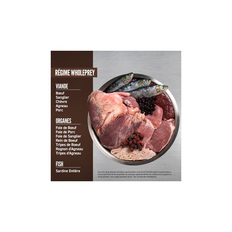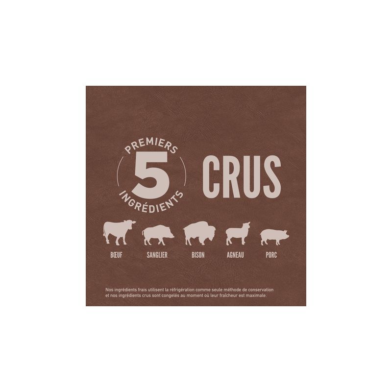 Viande crue (11 %), sardine crue entière (11 %), sanglier cru (5 %), bison cru (5 %), agneau cru (5 %), porc cru (5 %), foie de bœuf cru (4 %), foie de porc cru (4 %), œufs frais (4 %), agneau déshydraté (4 %), bœuf déshydraté (4 %), hareng déshydraté (4 %), sardine déshydratée (4 %), agneau déshydraté (4 %), porc déshydraté (4 %), huile de canola, lentilles rouges entières, pois chiches entiers, pois entiers, lentilles vertes entières, amidon de pois, foie d'agneau déshydraté (2 %), poisson blanc déshydraté (2 %), huile de merlan (2 %), haricots pintos entiers, haricots blancs entiers, fibre de lentilles, rognons d'agneau crus (0,5 %), tripes d'agneau crues (0,5 %), varech déshydraté, citrouille fraîche entière, courge butternut fraîche entière, courgettes fraîches entières, carottes fraîches entières, pommes fraîches entières, poires fraîches entières, racine de chicorée déshydratée, chou frisé frais, épinards frais, feuilles de betterave fraîches, feuilles de moutarde fraîches, canneberges entières, myrtilles entières, baies de saskatoon entières, curcuma, chardon-Marie, racine de bardane, lavande, racine de guimauve, cynorrhodon.