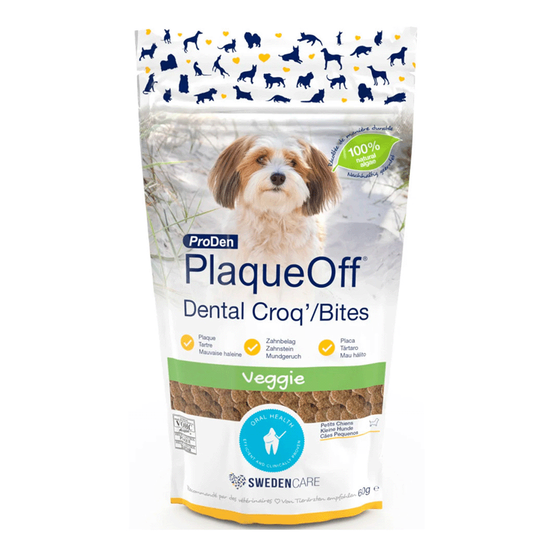 Plaque Off Croq est un complément alimentaire dentaire conçu pour maintenir l'hygiène buccale des chiens. Grâce à sa composition 100% végétale, sans conservateurs ni colorants artificiels, il aide à prévenir l'accumulation de tartre et de plaque dentaire, ainsi que la mauvaise haleine. Convient aux animaux de toutes races et tailles.