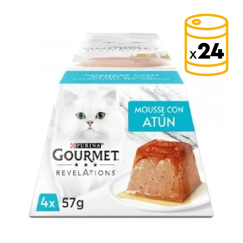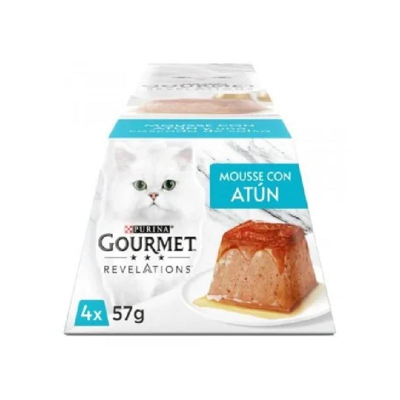 PURINA® GOURMET® Revelations 4x57g. Mousse raffinée et délicate au poulet. Idéale pour offrir à votre chat une expérience culinaire exquise ! GOURMET™ présente REVELATIONS™. Une sélection sophistiquée de délices sublimes parfaitement élaborés pour révéler une expérience culinaire exquise pour vous et votre chat. Chaque mousse raffinée et délicate est préparée avec des ingrédients de haute qualité et avec une cascade de délicieuse sauce pour offrir à votre chat une expérience culinaire exquise. GOURMET™ REVELATIONS™ : Une exquise sublimité, servie avec élégance. Gourmet est une alimentation 100% complète et équilibrée. De plus, c'est une source importante d'hydratation pour votre chat. De plus, vous lui offrirez une alimentation variée en saveurs et en textures pour son plaisir !