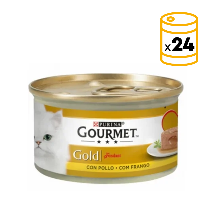 Les conserves au Poulet de Gourmet Gold Fondant offrent une mousse au poulet avec un coeur liquide à l'intérieur élaboré avec une sauce exquise. Une recette pour les chats adultes sans aròmes artificiels, sans colorants ni conservateurs.